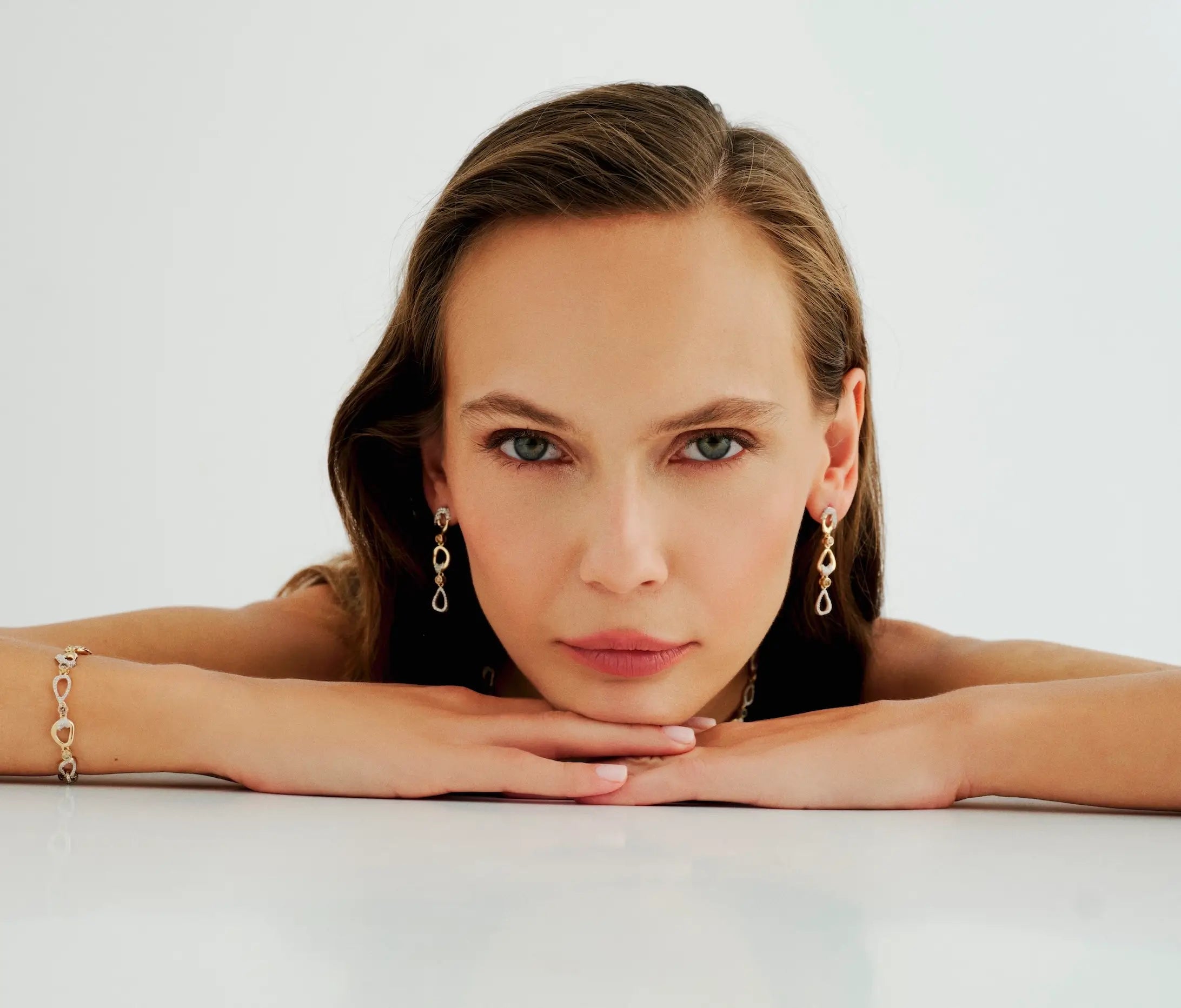 Flow Konyak Pırlanta Bilezik, kıvrımlı ve akışkan formlarıyla hayatın doğal ritmini güçlü bir tasarıma dönüştürüyor. Bilezik boyunca sıralanan amorfik halkalar, kimi pırlantalarla ışıldarken kimi yalın formlarıyla tasarıma denge katıyor. Aralara yerleştirilen konyak pırlantalar, tasarıma sıcak ve sofistike bir karakter kazandırarak bileziği özgün kılıyor.