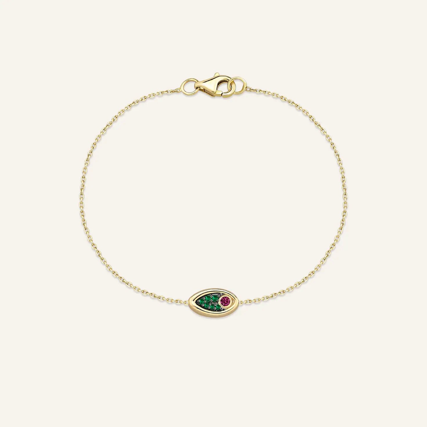 14 ayar altın bu bilezik, sade formunda güçlü bir denge taşır. Oval yapısındaki canlı yeşil savorayt taşları, doğanın yenileyici enerjisini yansıtırken; rodolit detayı tasarıma sıcak bir vurgu katıyor. Fragments Koleksiyonu’nun ruhunu yansıtan bu parça, farklı renklerin ve duyguların bir araya gelerek oluşturduğu bütünlüğü hatırlatır.
