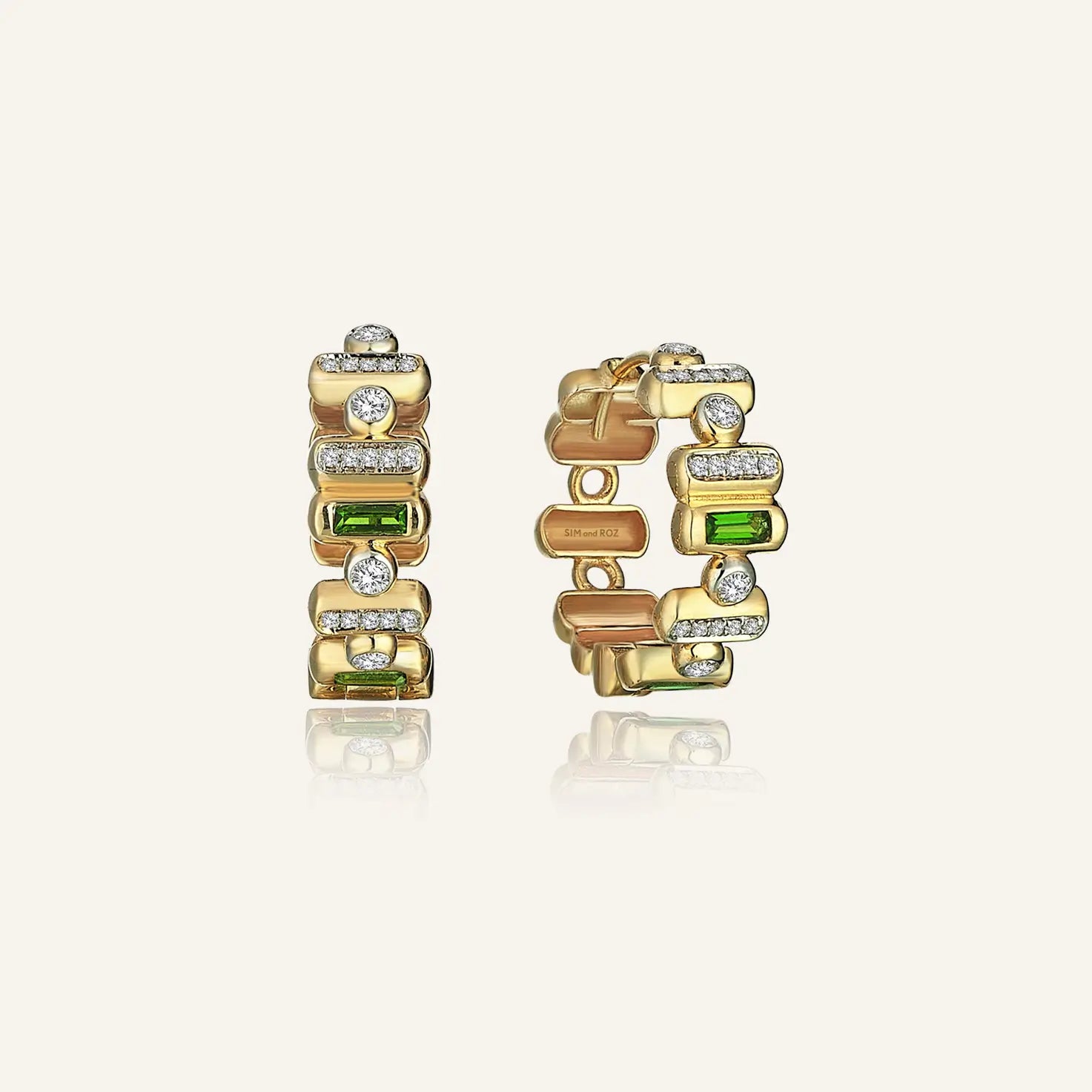 Işığın kırılmış çizgilerinden ilham alan Beams Baget Savorayt Halka Küpe, altın kapsüllerin arasına yerleştirilen baget savorayt taşları ve pırlantalarla özgün bir ritim yaratıyor. Savoraytın canlı yeşili tasarıma güçlü bir kontrast ve taze bir enerji katarken, pırlantaların ışıltısı bu etkiyi zarifçe tamamlıyor. Kapsüllerin yan yana gelişi, parçaların birleştiğinde ortaya çıkan bütünlüğü hatırlatıyor.