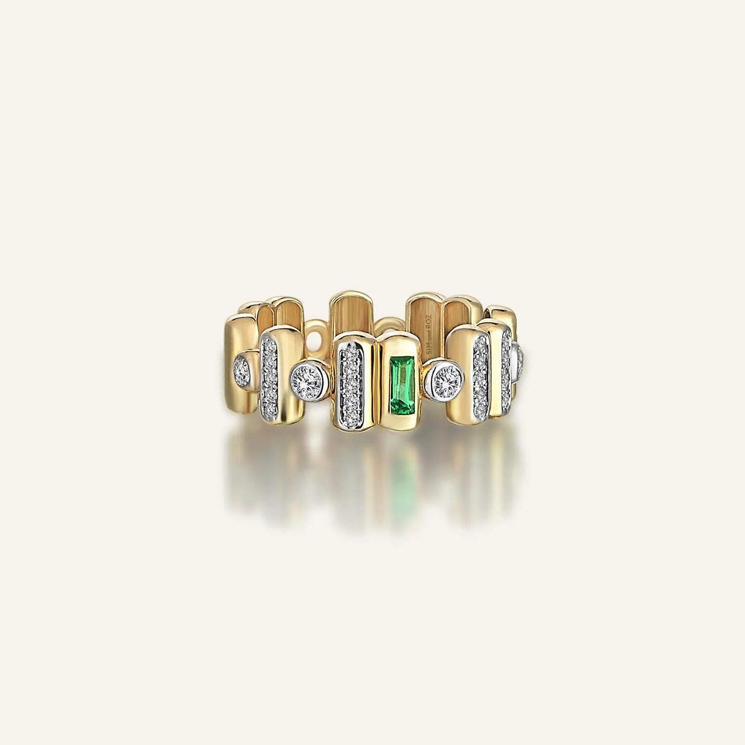 Beams Baget Savorayt Yüzük, ışığın kırıldığı anı yakalıyor. 14 ayar altının sıcak dokusu, baget kesim savorayt taşı ve pırlantalarla birleşerek ışığın farklı yönlere dağılmış enerjisini somutlaştırıyor. Her kapsül form, bir ışık parçasını temsil ederken, birlikte ritmik bir bütünlük oluşturuyor. Savorayt’ın derin yeşil tonu, doğadaki yenilenme ve dengeyi hatırlatıyor. Zamansız formuyla etkileyici bir görünüm yaratan bu yüzük, her stile kolayca uyum sağlıyor.