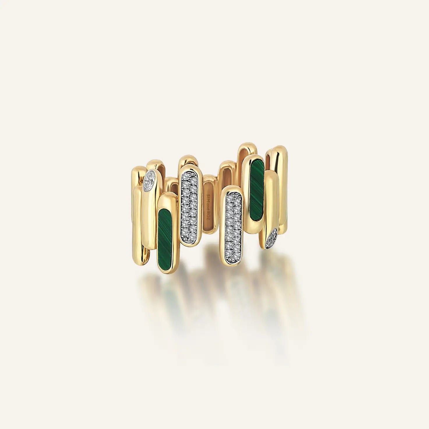 14 Ayar Altın, Pırlanta & Malakit Taşlı Dikey Formlu Yüzük