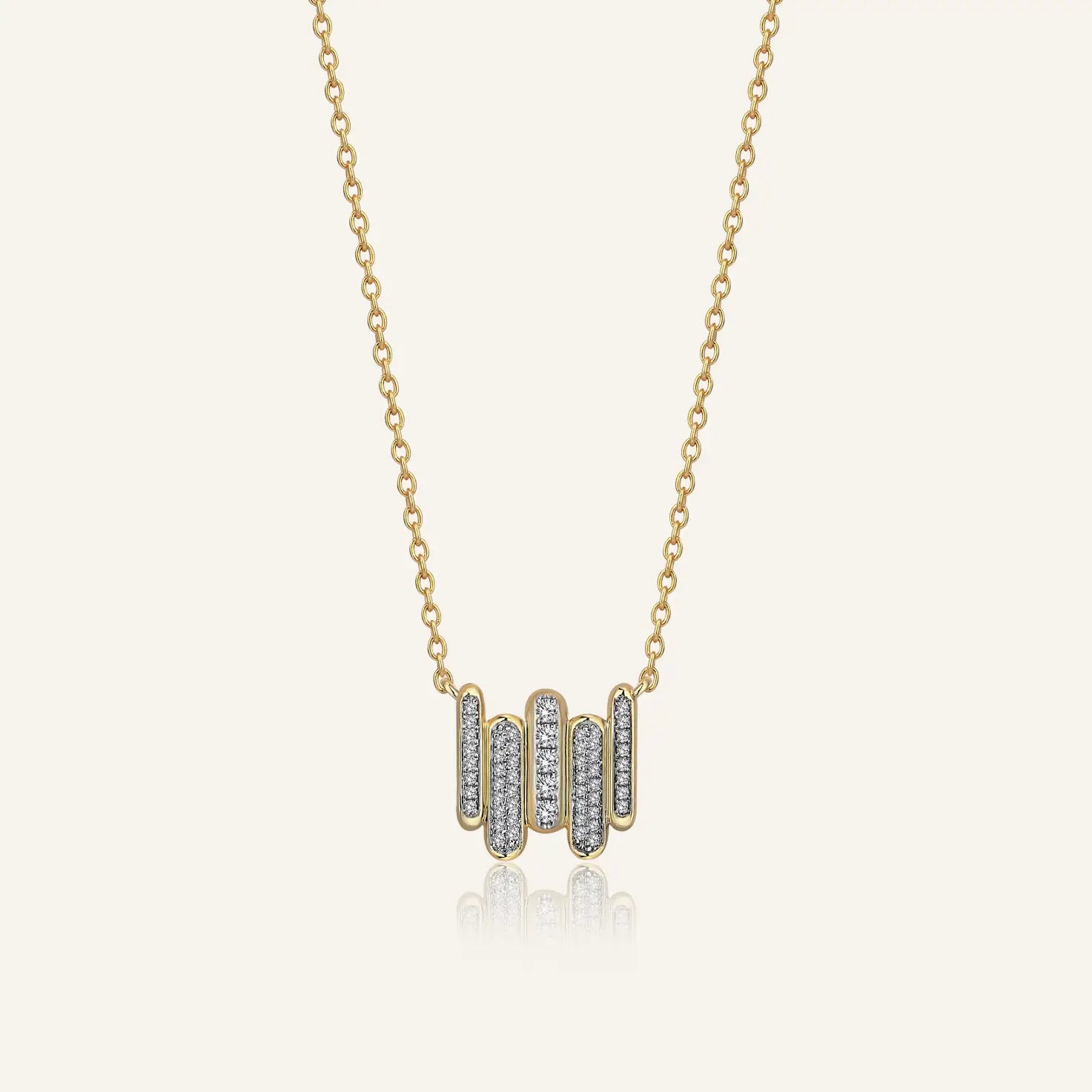 Kalın ve ince altın çubukların üzerine yerleştirilmiş pırlantalarla tasarlanan bu kolye, ışığın bıraktığı yansımaları modern bir forma dönüştürüyor. Farklı boyutlardaki parçaların yan yana gelişi, Fragments Koleksiyonu’nun özünü yansıtarak tek başına küçük görünen detayların birleştiğinde nasıl anlamlı bir bütün oluşturduğunu hatırlatıyor. Gündelik stile sade ama dikkat çekici bir ışıltı katıyor.