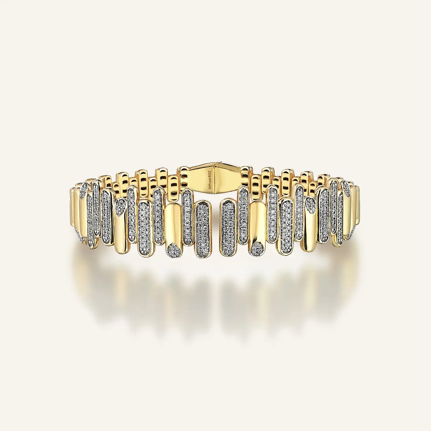 Işığın kırılmış parçalarından ilham alan Beams Pırlanta Bilezik, farklı boyutlardaki altın kapsüller üzerine yerleştirilen pırlantalarla güçlü bir ritim yaratıyor.