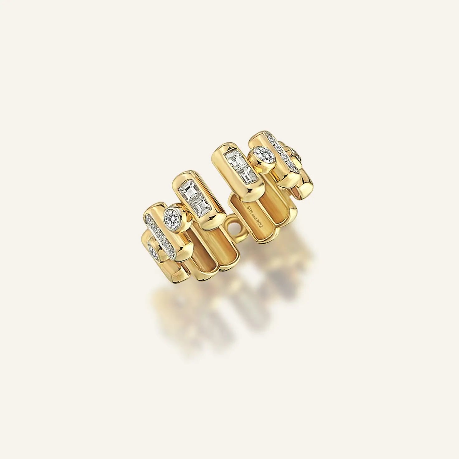 Işığın bıraktığı yansımaları yakalayan Beams Pırlanta Serçe Parmak Yüzük, serçe parmakta taşındığında kişisel ifade ve özgünlük sembolüne dönüşüyor. Tarih boyunca serçe parmak yüzükleri bireysellik ve farklı duruşun işareti olmuştur; bu yüzükte ince altın kapsüllerin üzerine işlenmiş pırlantalar, kişinin kendi yolunu aydınlatma gücünü temsil ediyor. Tek başına güçlü bir karakter taşır; koleksiyonun diğer parçalarıyla birlikte ışığın ritmini çoğaltır.
