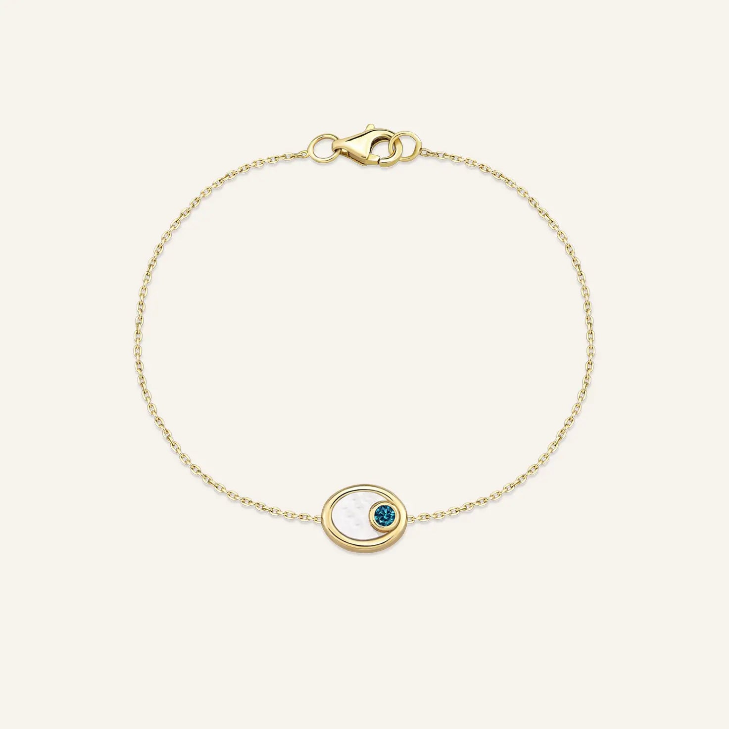 14 ayar altından tasarlanan bu zarif bilezik, sade formunda zarafet ve dengeyi bir araya getiriyor. Oval yapısındaki sedef, doğallığın ve içsel sakinliğin sembolüyken; mavi topaz detayı tasarıma canlılık ve derinlik katıyor. Fragments Koleksiyonu’nun özünü yansıtan bu parça, farklı unsurların bir araya gelerek oluşturduğu uyumu hatırlatıyor.