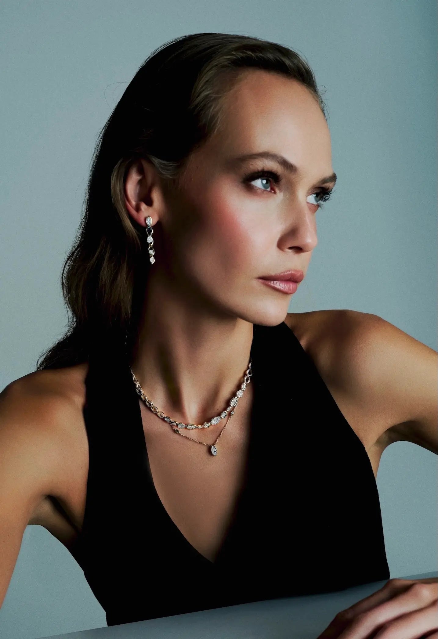 Loops Pırlanta Zincir Kolye, zincir boyunca yerleştirilen pırlantalı oval formlarıyla hayatın döngülerinden ilham alıyor. Her form, farklı bir izi ya da anıyı simgelerken, bir araya geldiklerinde kusursuz bir bütünlüğün ifadesine dönüşüyor. Pırlantaların ışığı, kolyeye zarif bir ritim ve ince bir ışıltı katıyor.