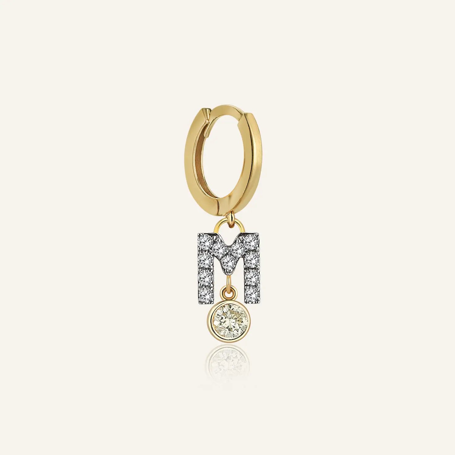 M Harfi Pırlanta Küpe, 14 ayar altının zarif parlaklığını pırlantaların ışıltısıyla bir araya getiriyor.