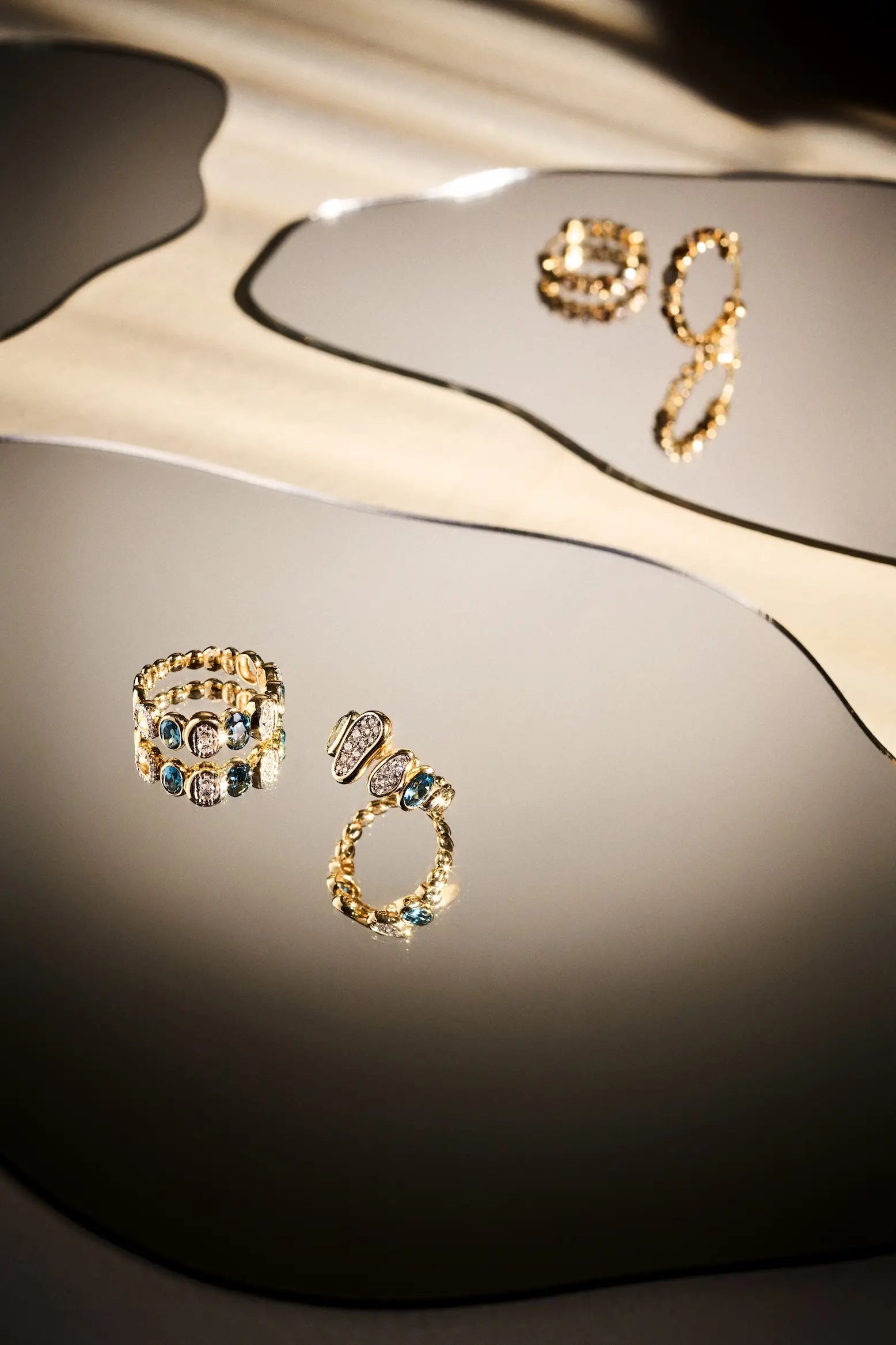 Where the shimmering diamonds meet the serene blue of topaz, the ring becomes a symbol of life’s diversity and ever-evolving cycles. With its sculptural balance and luminous character, it stands as one of the most defining pieces of the Fragments Collection.