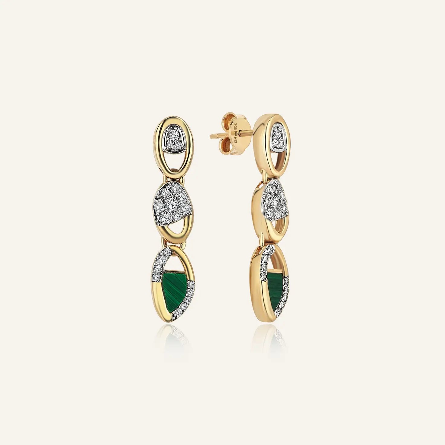 14 Ayar Altın, Pırlanta & Malakit Taşlı Çoklu Formlu Sallantılı Küpe