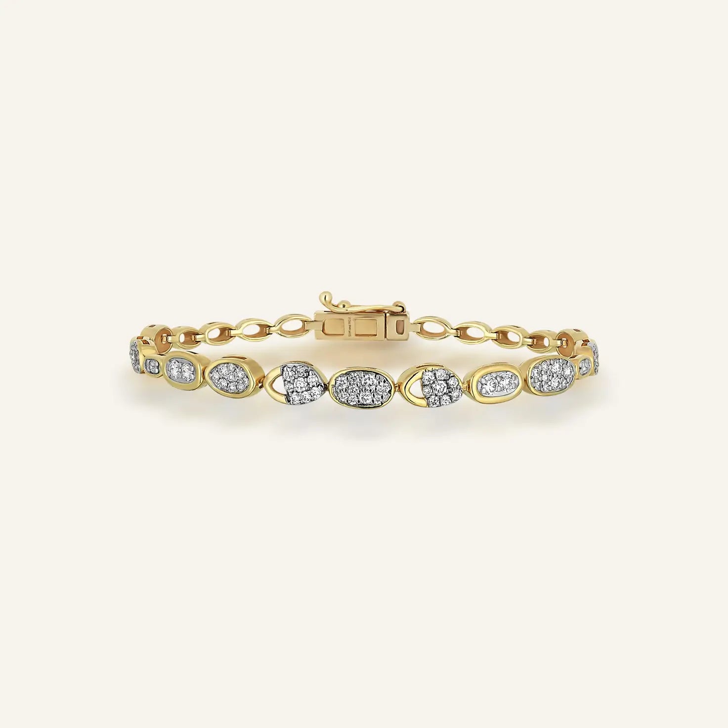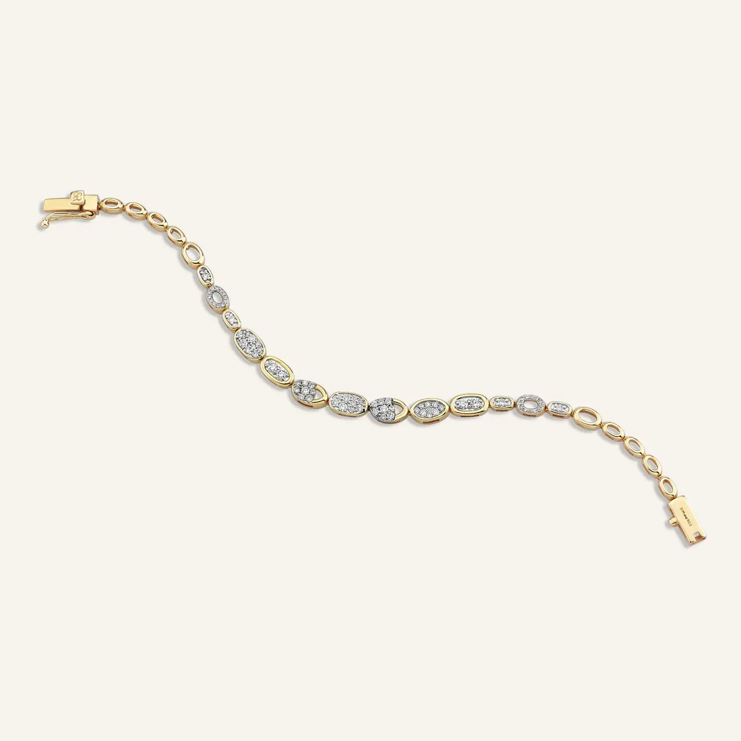 Loops Pırlanta Bilezik, Fragments Koleksiyonu’nun zamansız şıklığını yansıtan güçlü bir tasarım. Küçük ve büyük oval parçaların dengeli birleşimi, pırlantaların farklı yoğunluklarda ışıldamasıyla ritmik bir akış ortaya çıkarıyor.